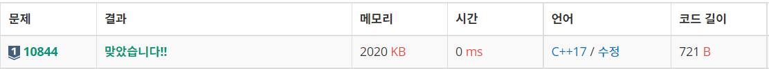 길이가 i이면서 i자리의 수가 j인 계단 수의 갯수를 dp[i][j]라고 하자.