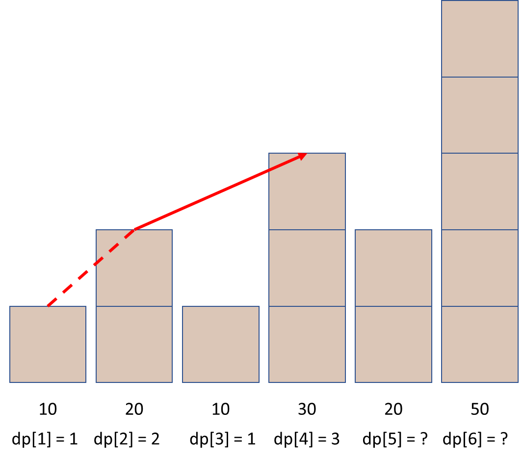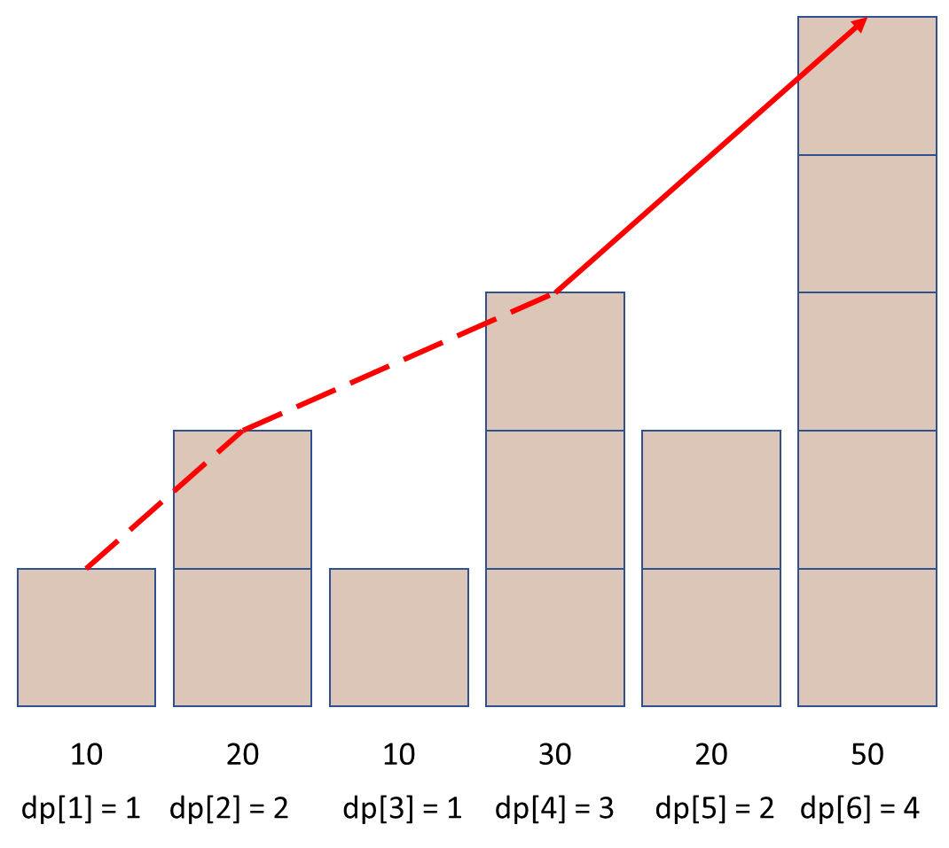 그게 아니라면, 이후 1 <= j < i 범위를 오름차순으로 돌면서 arr[i]가 arr[j]보다 큰 경우에, dp[j]의 수열에 arr[i]를 추가해서