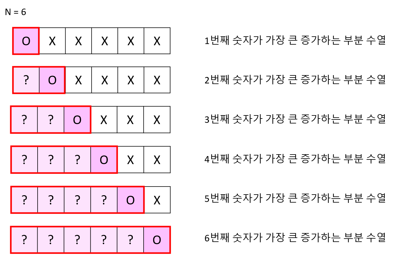 1<= i <=N 일 때, 각 i번째까지의 숫자들 중에서 i번째 숫자가 가장 큰 증가하는 부분 수열을 구하는 각 각의 경우들을 다 모은 합집합에 포함되어 있다.